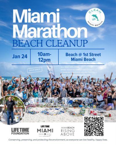 On Saturday, January 27th, the Life Time Foundation and the Life Time Miami Marathon & Half are collaborating with Clean Miami Beach to bring volunteers and fund the efforts to clean the shores of South Beach. Clean Miami Beach is dedicated to keeping the local community and natural habitats free of garbage and harmful pollutants with primary focus on single-use plastics.